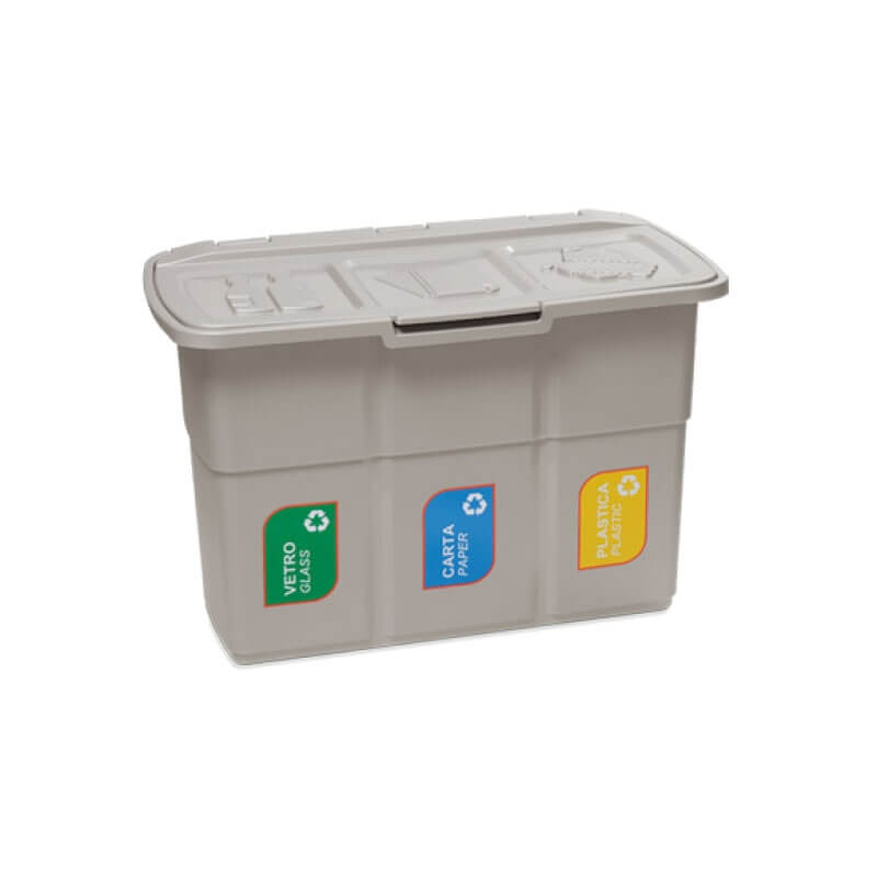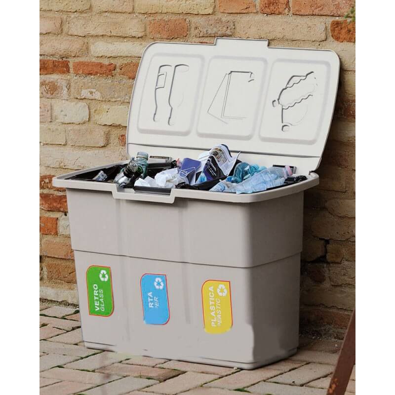 Изделие состоит из трех отделений, каждое объемом 25 литров. На внутренней стороне крышки имеются указатели, помогающие определить, куда складывать бумагу, стекло и пластик, что делает процесс сортировки простым и доступным даже для детей.