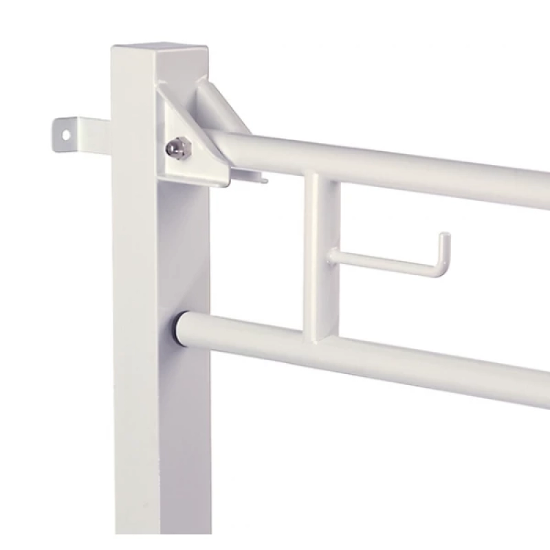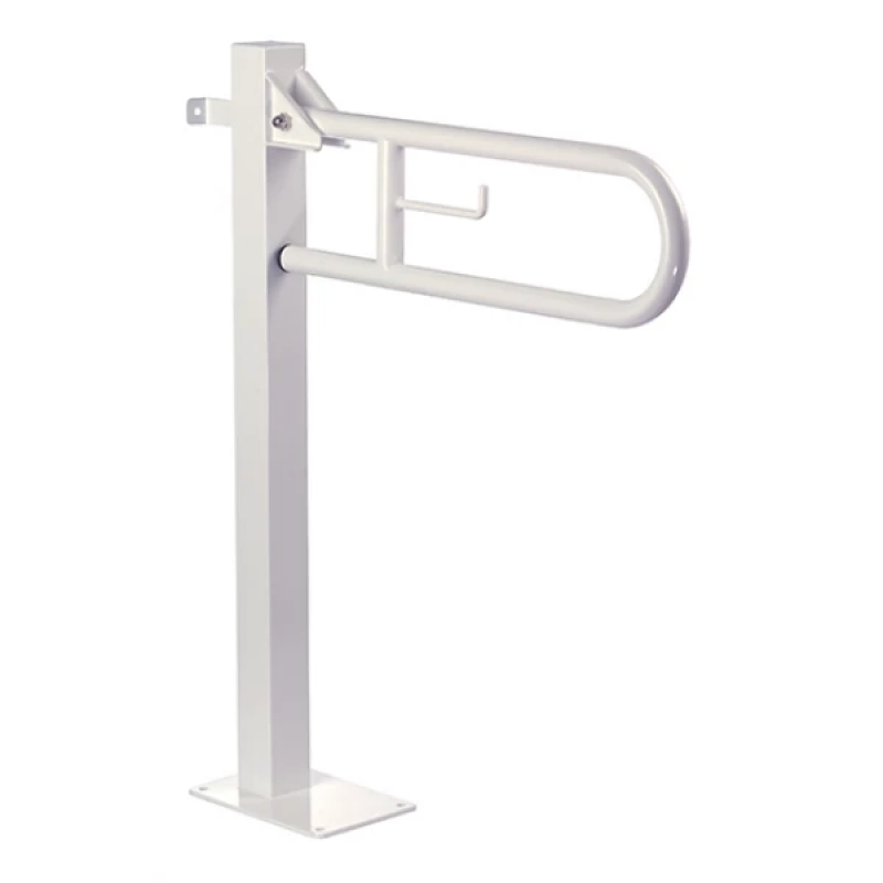 Откидной механизм позволяет перевести поручень из вертикального положения в горизонтальное. Простая система блокировки надежно фиксирует поручень в выбранном положении. Дополнительное удобство обеспечивает встроенный держатель для туалетной бумаги.