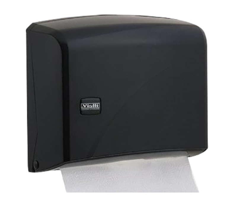 Держатель бумажных полотенец K1B предназначен для использования в местах с высокой посещаемостью. Узкий корпус выполнен из прочного черного пластика, обеспечивая вместимость до 200 листов формата Z-складка. Замок, расположенный сверху, упрощает замену расходных материалов. В комплект входят ключ и крепеж.