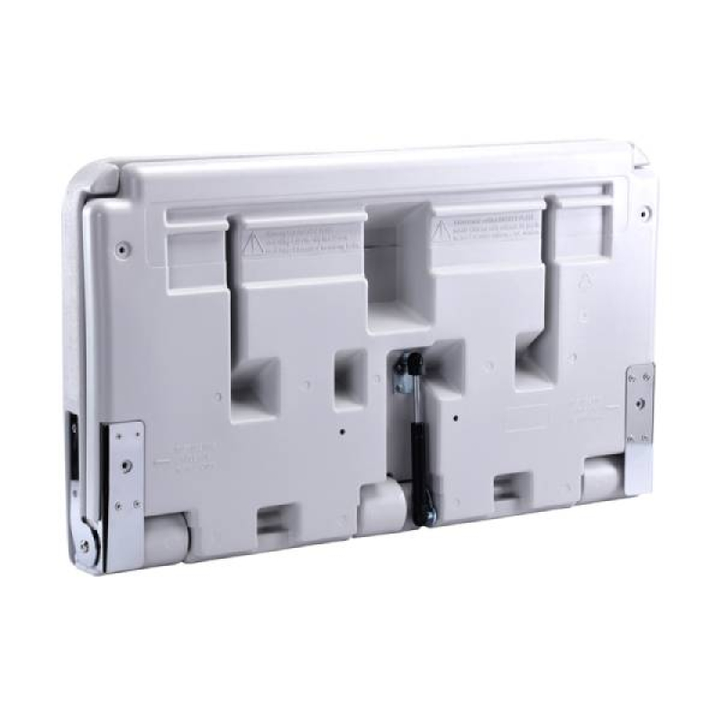 Конструкция имеет встроенный стальной каркас, усиленные стальные шарниры по всей длине и монтажный кронштейн, что исключает пластический износ и обеспечивает долговечность изделия. Механизм с пневматической пружиной гарантирует плавное и бесшумное открывание и закрывание, что повышает комфорт использования. Встроенные емкости для одноразовых пеленок и два крючка для сумок обеспечивают удобство для родителей, а защитный ремень с замками-защелками позволяет безопасно закрепить ребенка на столике. Противомикробная поверхность препятствует размножению бактерий и помогает поддерживать гигиену.