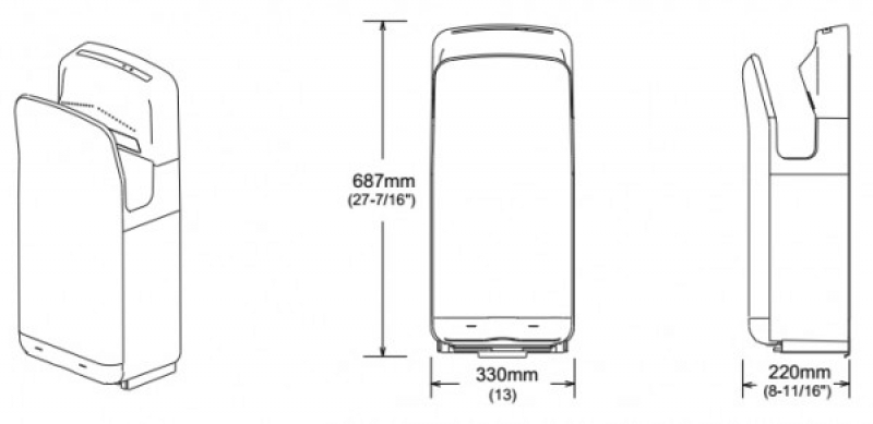 - Быстрая сушка: мощный поток воздуха (324 км/ч) обеспечивает сушку рук за 6–8 секунд.