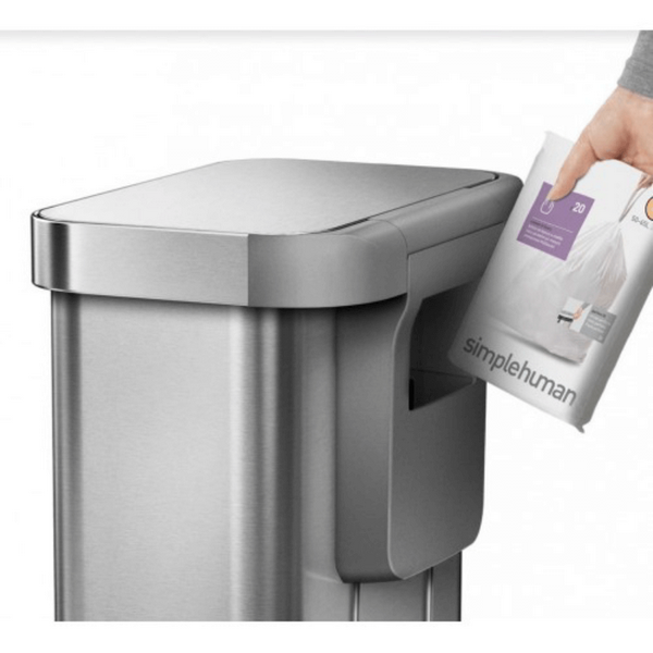 Особенностью этой урны является встроенный карман для хранения запасных мешков, что значительно ускоряет их замену. Обод из нержавеющей стали фиксирует мусорный мешок внутри, скрывая его и создавая эстетичный вид. Отсутствие внутреннего ведра позволяет использовать больше пространства для мусора.