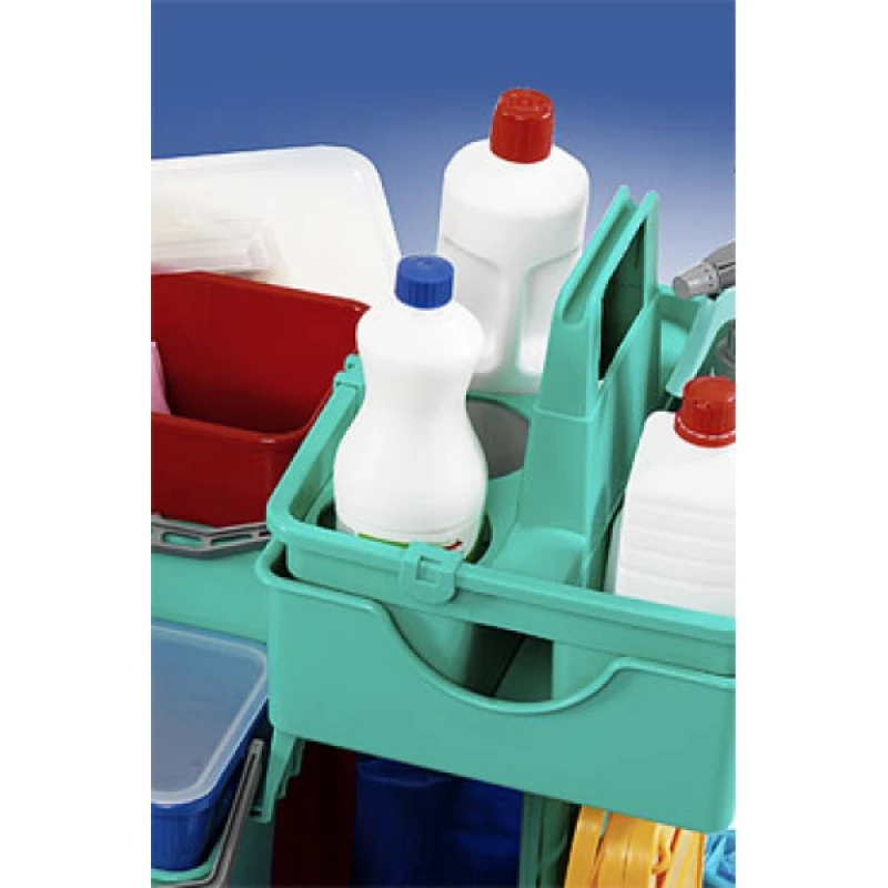 Лоток двойной для уборочного инвентаря 0E003518 от итальянского производителя TTS предназначен для хранения и удобной транспортировки моющих средств, бутылок и других необходимых для уборки принадлежностей.