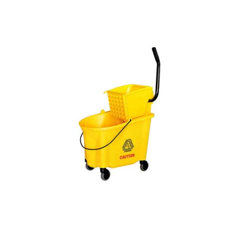 Ведро оснащено механизмом для отжима, который позволяет эффективно удалять излишки воды с уборочного инвентаря.