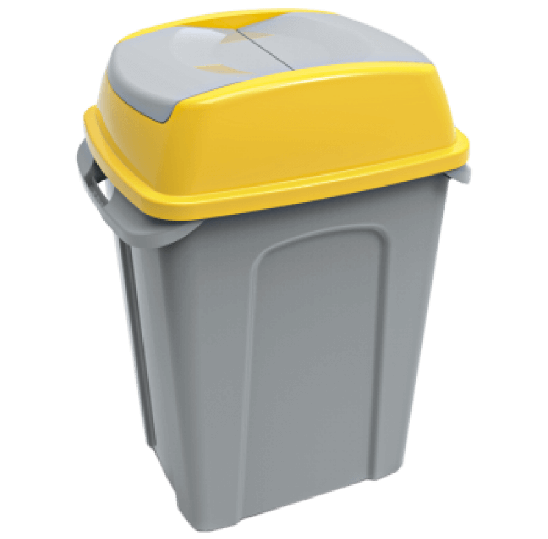 Бак оснащений кришкою, розділеною на дві частини, які відкриваються всередину. Це дозволяє викидати сміття, натискаючи або на обидві частини одночасно, або лише на одну. Кришка надійно фіксує сміттєвий пакет, запобігаючи його випадінню. Для зручності перенесення бак має два виступи (ручки).