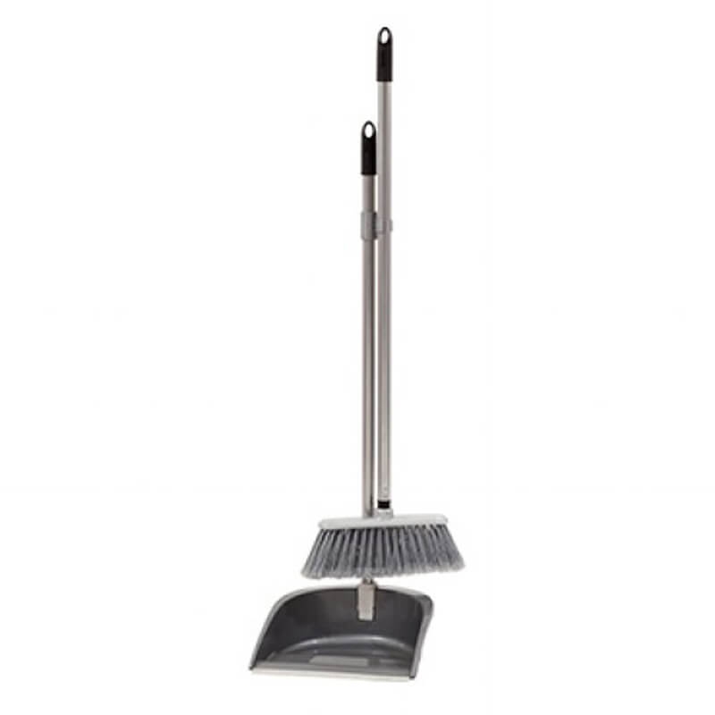 Совок виготовлений із міцного поліпропілену, щетина щітки – з полівінілхлориду висотою 7 см, що дозволяє ефективно збирати сміття та пил. Рукоятки металеві з поліпропіленовим покриттям для надійного захвату, на них передбачено отвір для підвішування на гачок, що зручно для зберігання. У наборі також доступний совок сірого кольору.