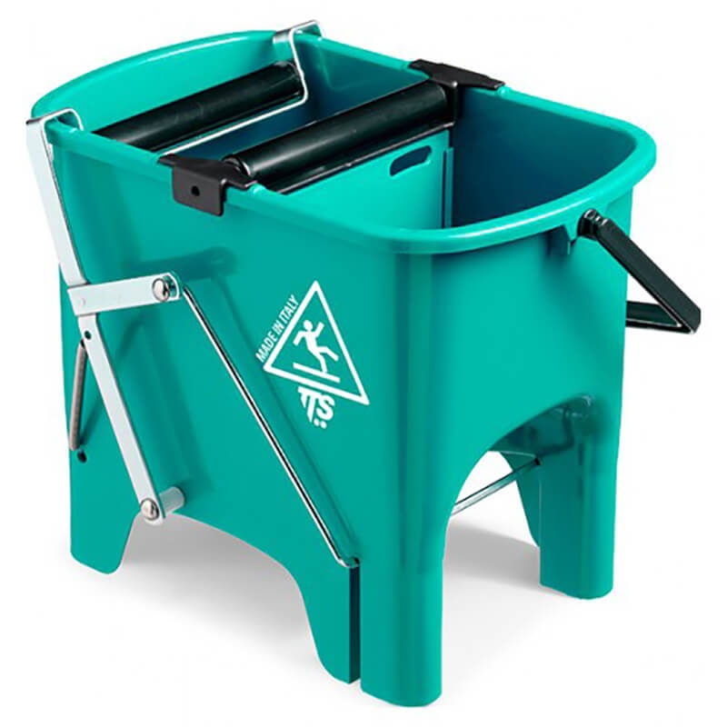 Подвійне відро виготовлене з міцного поліпропілену зеленого кольору, стійкого до механічних пошкоджень і впливу мийних засобів. Воно оснащене роликовим віджимом, який допомагає ефективно видаляти вологу з мопа, і педаллю для додаткової зручності. Для перенесення відра передбачена міцна поліпропіленова ручка.Характеристики: